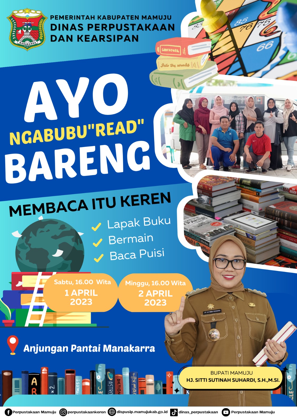 Mamuju, 8enam.com.-Dinas Perpustakaan dan Kearsipan Kabupaten Mamuju akan menggelar giat pekan literasi dengan tema Ngabubu”Read” di anjungan pantai Manakarra Mamuju, Sabtu 1 April dan minggu 2 April 2023