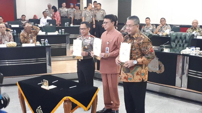 Kapolri Jenderal Tito Karnavian bersama Mendagri Tjahjo Kumolo dan Kemendes PDTT Eko Sandjojo menandatangani nota kesepahaman (MoU) tentang pencegahan, pengawasan, penanganan permasalahan dana desa (Audrey/detikcom)