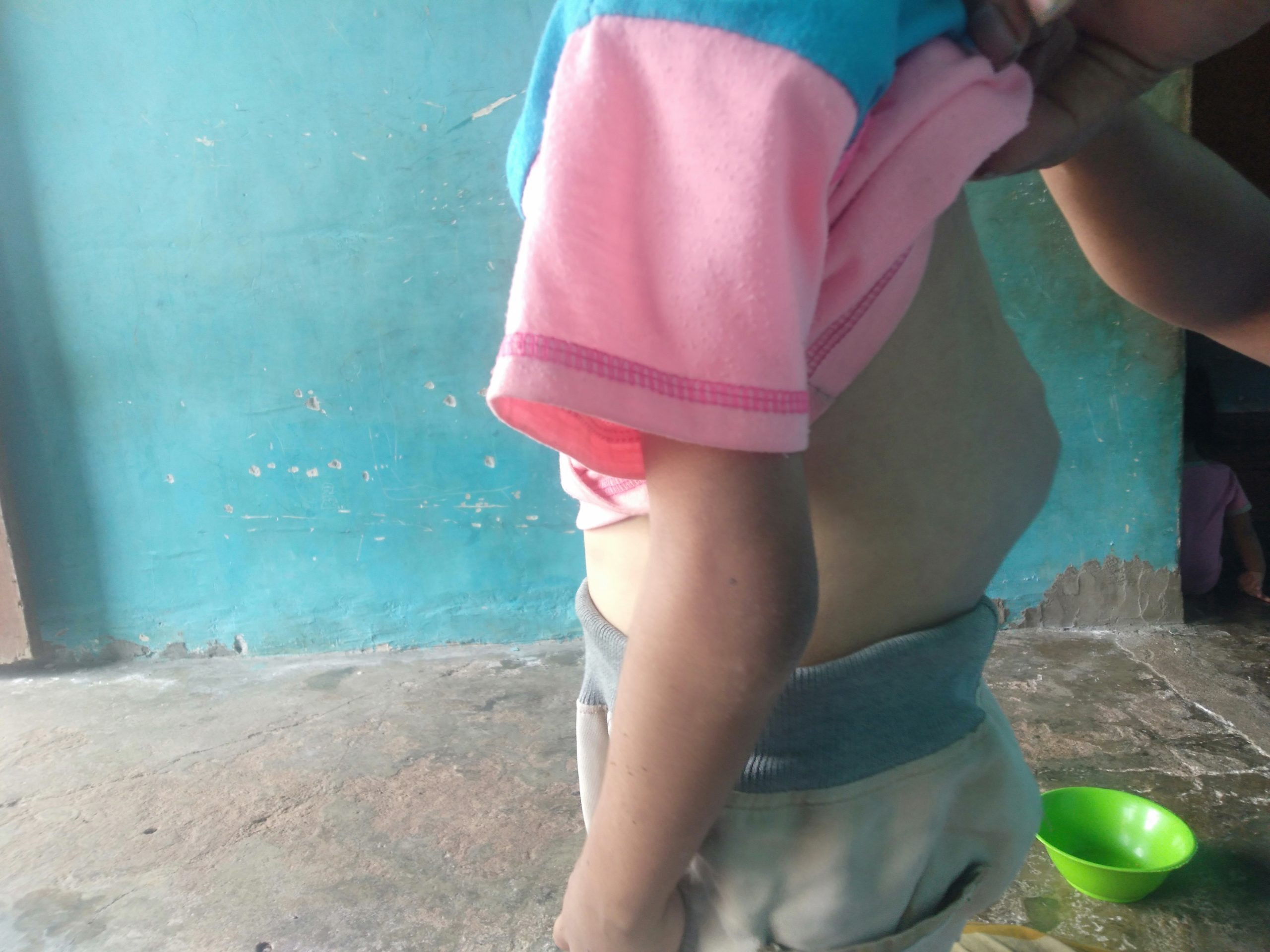 Selain bengkok tulang belakang, perut bagian bawah bocah 7 tahun ini juga keras, tidak seperti perut anak pada umumnya.