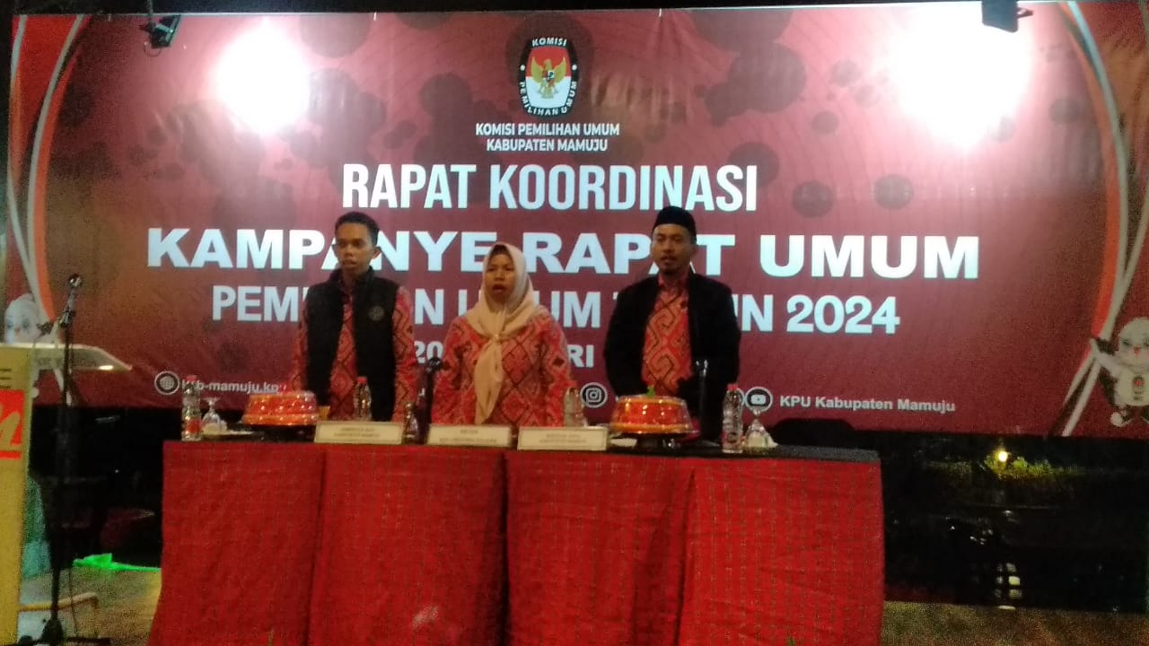 Mamuju, 8enam.com.-Komisi Pemilihan Umum (KPU) Kabupaten Mamuju menggelar rapat koordinasi kampanye rapat umum pemilihan umum tahun 2024 yang berlangsung di Plaza Waterpark Grand Maleo Hotel & Convention Mamuju, Sabtu (20/1/2024)
