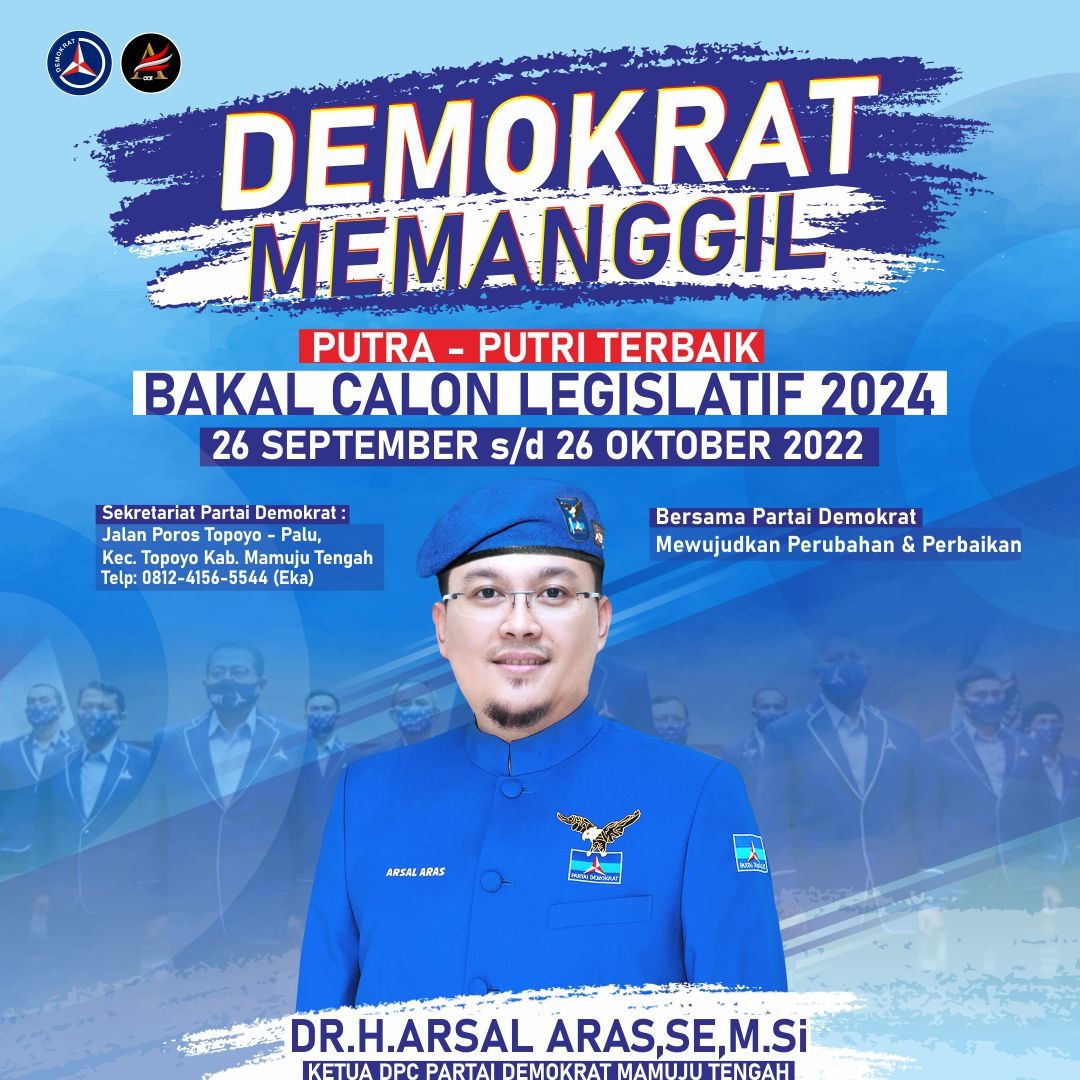 Ketua DPC Partai Demokrat Mateng, Dr H Arsal Aras mengatakan, Partai Demokrat memanggil putra- putri terbaik Kabupaten Mamuju Tengah untuk bergabung dan mendaftarkan diri menjadi Bacaleg di Partai Demokrat.