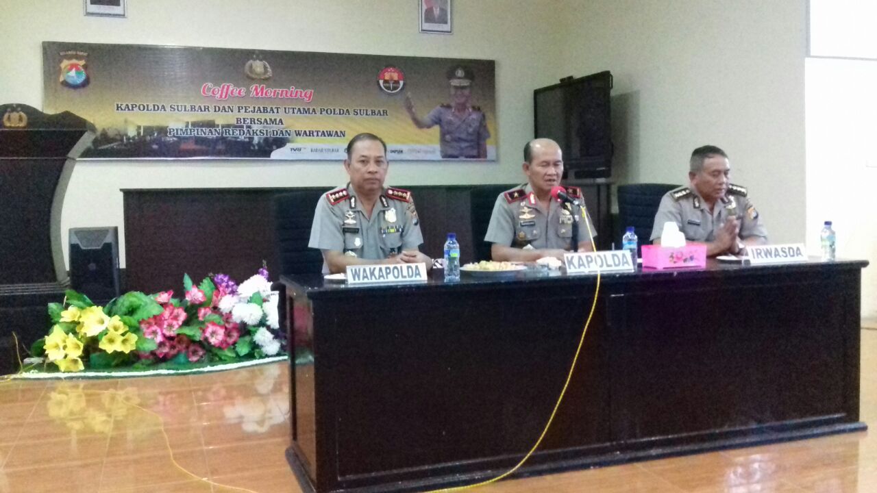 Coffe Morning yang di gelar di Aula Mapolda Sulbar, Jalan Ahmad Kirang Mamuju dipimpin langsung Kapolda Sulbar Brigjen Pol. Nandang didampingi Wakapolda Kombes Pol. Tajuddin dan kabid humas AKBP Hj. Mashura serta jajaran pejabat utama polda sulbar