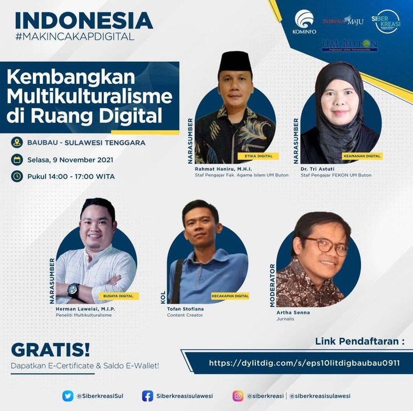 Program kali ini menghadirkan empat narasumber yang terdiri dari Kreator Konten Tofan Stofiana, Staf Pengajar Fak. Agama Islam UM Buton Rahmat Haniru, Peneliti Multikulturalisme Herman Lawelai, dan Staf Pengajar FEKON UM Buton Tri Astuti. Adapun yang bertindak sebagai moderator adalah Artha Senna selaku jurnalis. Rangkaian Program Literasi Digital “Indonesia Makin Cakap Digital” di Sulawesi menargetkan 57.550 orang peserta.