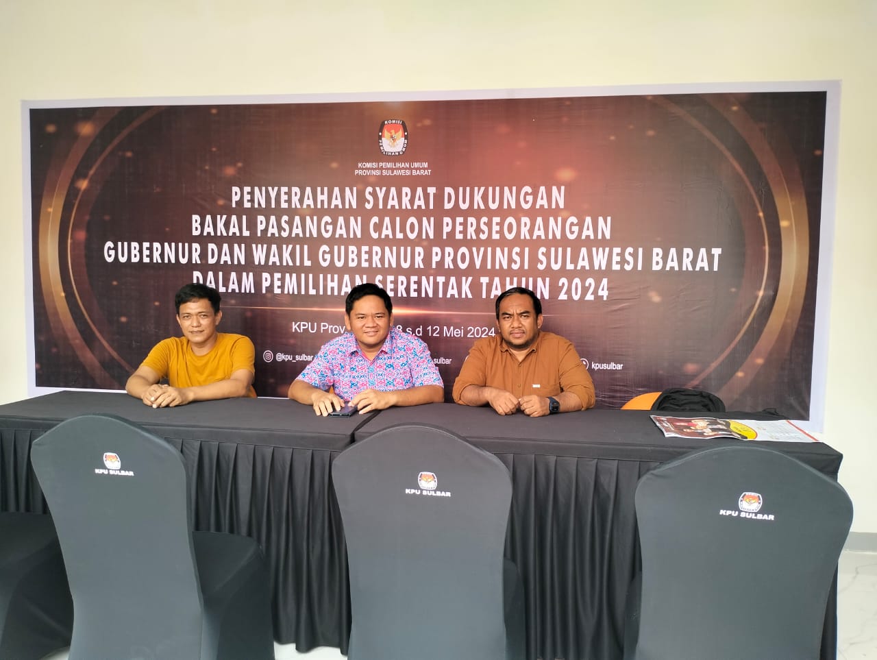 Selama pelayanan helpdesk penyerahan dukungan pasangan calon perseorangan di Kantor KPU Provinsi Sulawesi Barat, yang dibuka sejak Tanggal 8 sampai 12 Mei, tidak ada bakal pasangan calon yang menyerahkan syarat dukungan.