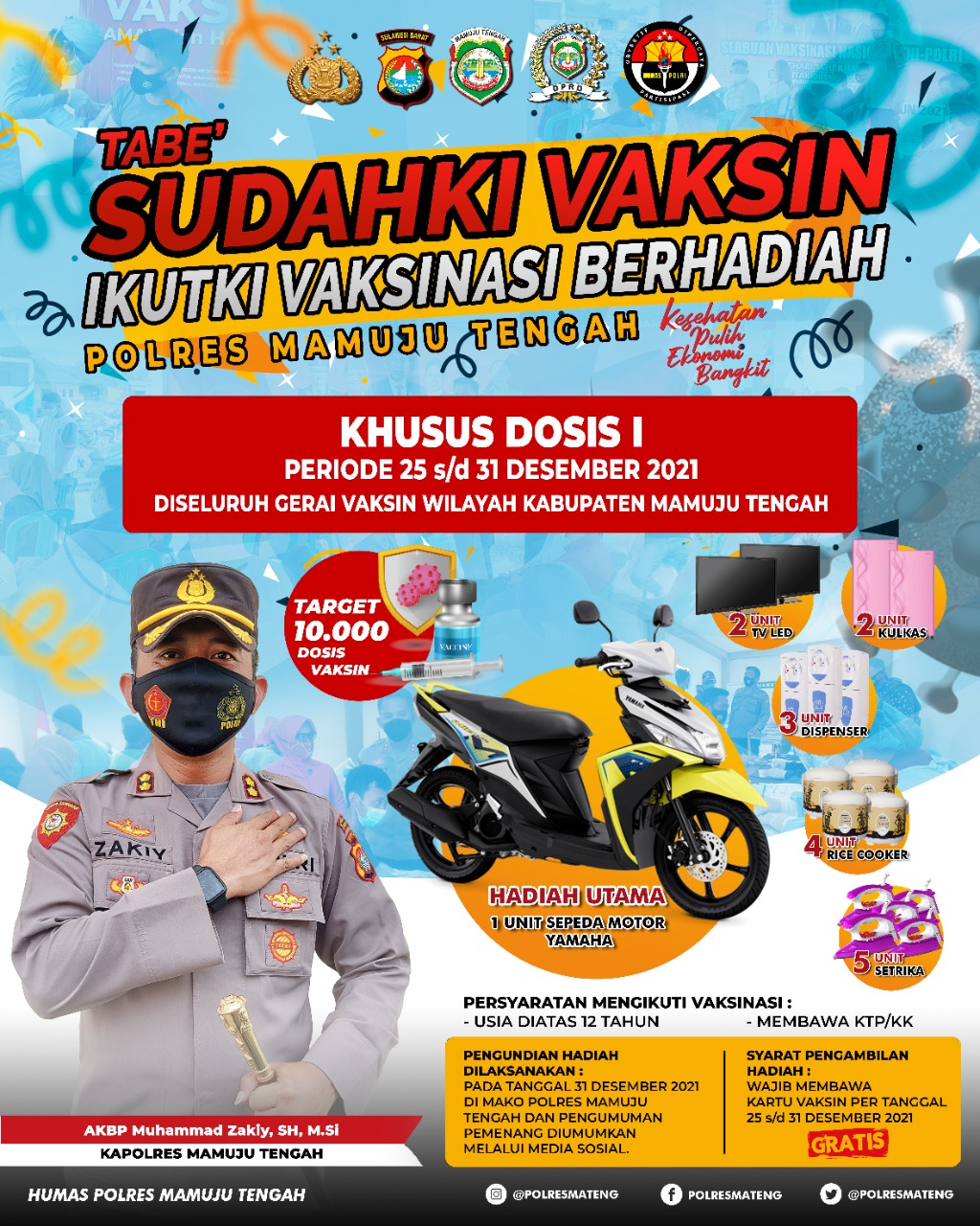 “Bagi masyarakat yang akan divaksin terlebih dahulu mengumpulkan fotocopy KTP, kemudian pada saat diundi nomor NIK nya yang disebut. Hadiah yang disiapkan yakni 1 unit sepeda motor, 2 unit TV LED, 2 Unit Kulkas, 3 Unit Dispenser, 4 Unit Rice Cooker, 5 Unit Setrika serta berbagai hadiah menarik lainnya dan akan di undi pada malam Tahun Baru nantinya,”kata Kapolres Mateng, AKBP Muh. Zaky, Sabtu (25/12/2021).