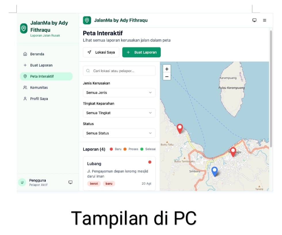 Pemprov Sulbar juga menyediakan laman berbasis web di https://app–jalan-ma-76c7c030.base44.app bagi masyarakat yang lebih nyaman melapor melalui komputer.