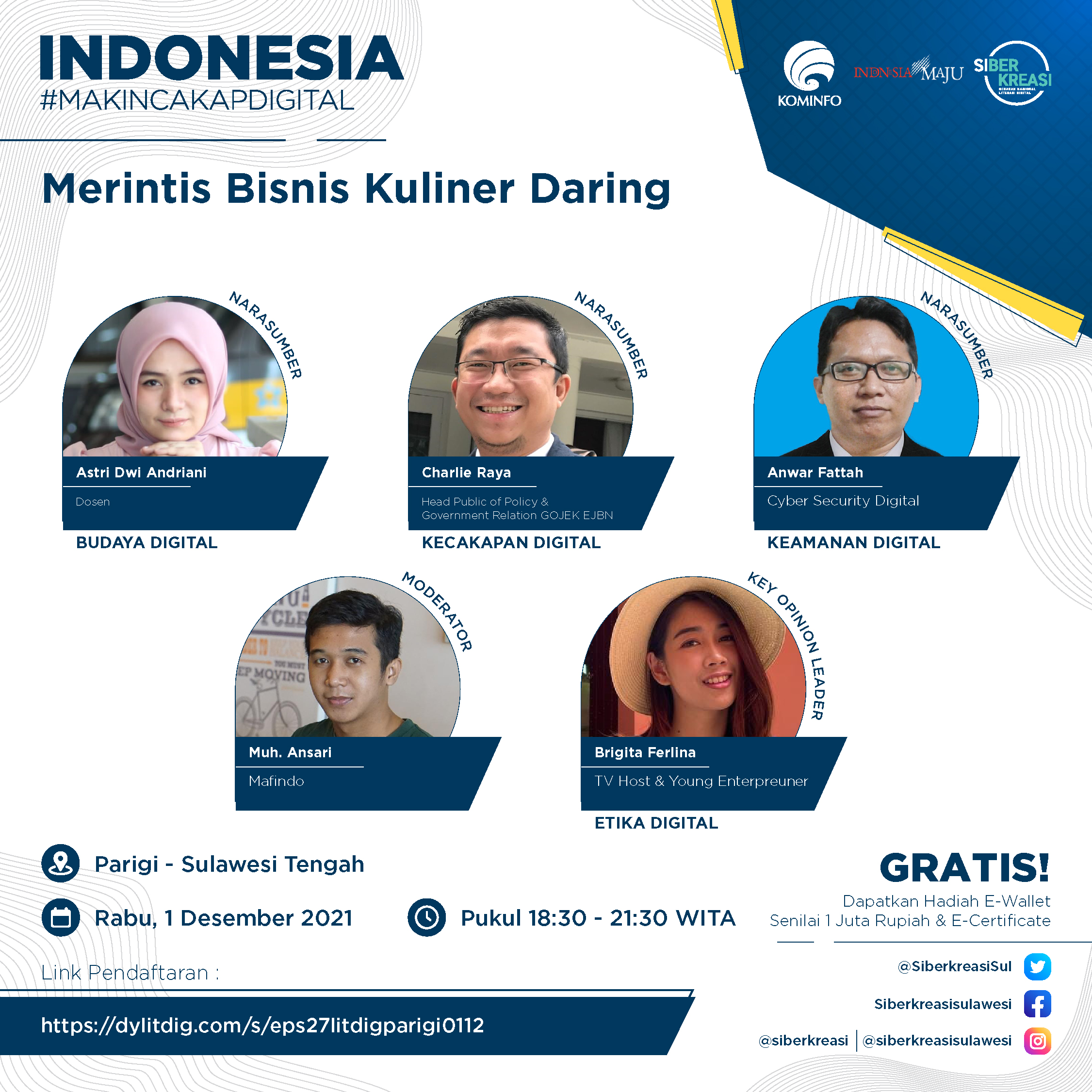 Parigi, 8enam.com.-Mengangkat tema “Merintis Bisnis Kuliner Daring”, Kementerian Komunikasi dan Informatika Republik Indonesia menggelar Program Literasi Digital “Indonesia Makin Cakap Digital” di Sulawesi secara virtual pada 1 Desember 2021 di Parigi, Sulawesi Tengah.