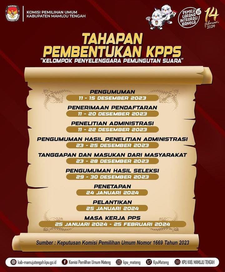 Mateng, 8enam.com.-KPU Kabupaten Mamuju Tengah mulai merekrut calon anggota Kelompok Penyelenggara Pemungutan Suara (KPPS) untuk Pemilihan Umum (Pemilu) tahun 2024.
