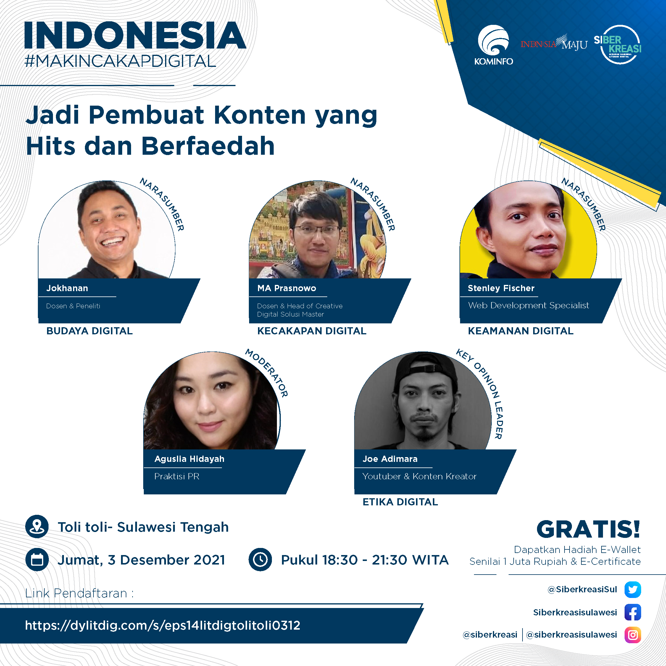 Program kali ini menghadirkan empat narasumber yang terdiri dari Dosen & Head of Digital Creative SoroganPreneur, M. A. Prasnowo; YouTuber & Kreator Konten, Joe Adimara; Dosen & Peneliti, Jokhanan Kristiyono; serta Web Development Specialist, Stenley Fischer. Adapun yang bertindak sebagai moderator adalah Praktisi Humas Aguslia Hidayah. Rangkaian Program Literasi Digital “Indonesia Makin Cakap Digital” di Sulawesi menargetkan 57.550 orang peserta.