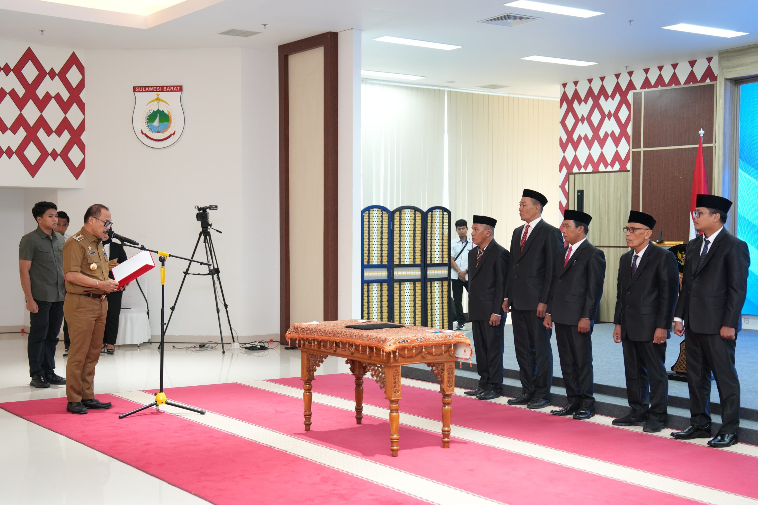 Turut hadir Wakil Gubernur Sulbar Salim S Mengga, Wakil Ketua DPRD Sulbar St. Suraidah Suhardi, perwakilan pemkab enam kabupaten se- Sulbar dan sejumlah pimpinan forkopimda Sulbar, menyaksikan pelantikan di Aula Lantai III Kantor Gubernur Sulbar, Rabu 5 Maret 2025.