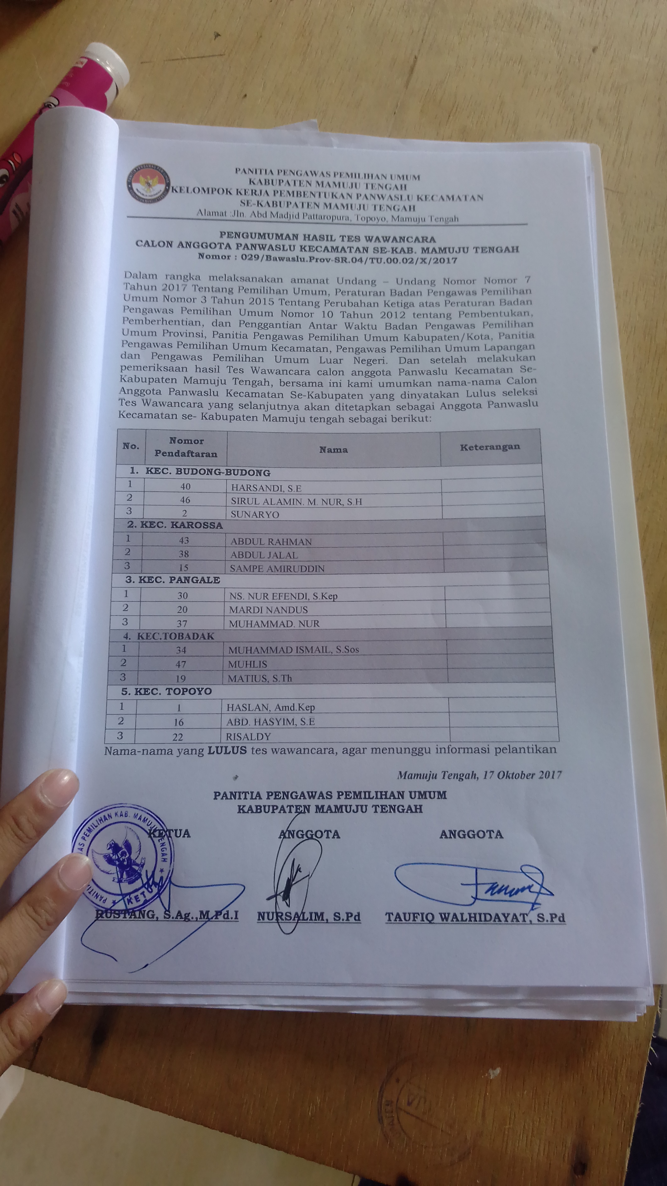 Mateng, 8enam.com.-Sesuai hasil pengumuman tes wawancara calon anggota Panitia Pengawas Kecamatan (Panwascam) se Kabupaten Mamuju Tengah (Mateng) nomor : 029/Bawaslu.Prov.SR.04/TU.00.02/X/2017, 15 orang dinyatakan lulus dan menunggu informasi jadwal pelantikan.