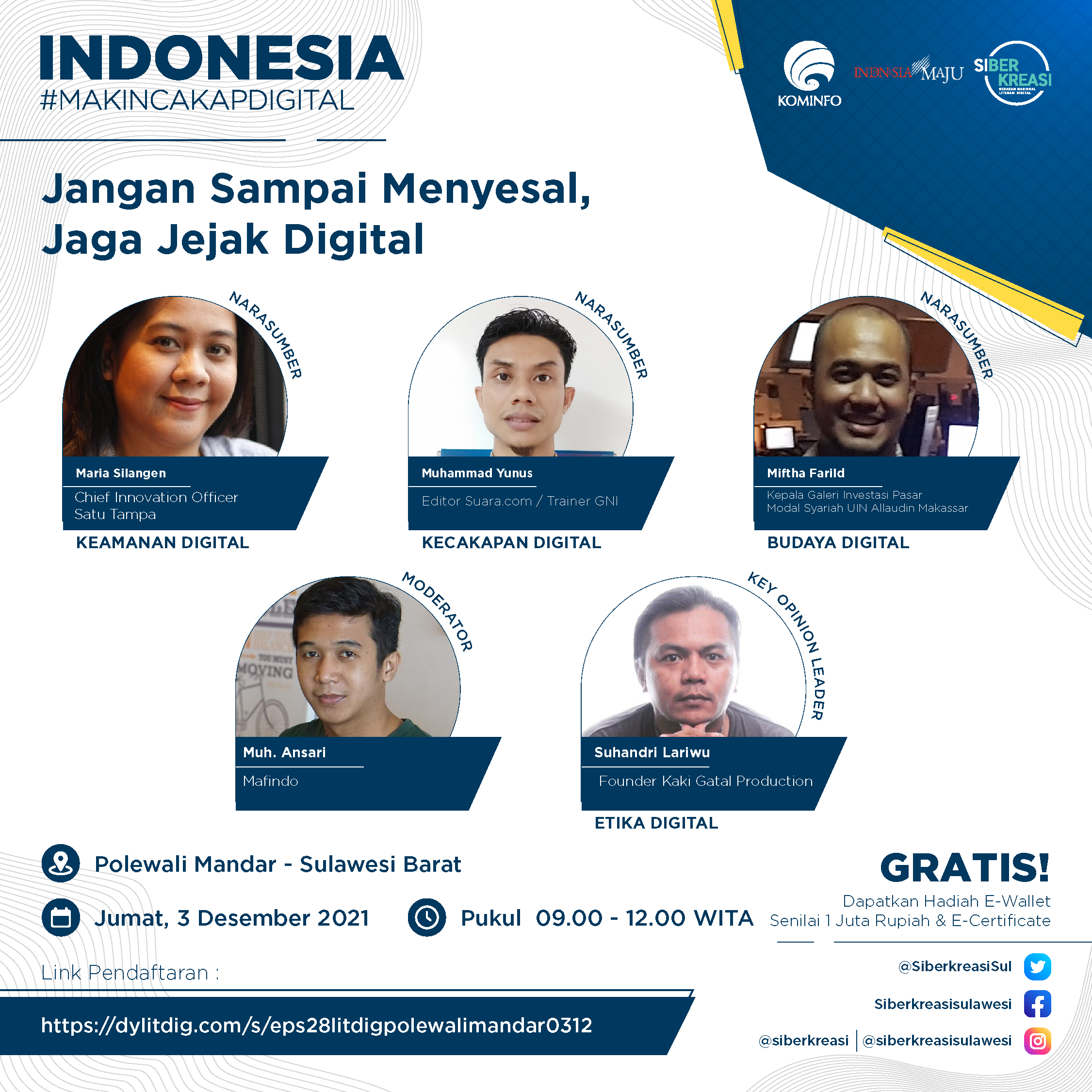Polewali Mandar, 8enam.com.-Kolaborasi Siberkreasi bersama Dyandra Promosindo, Kementerian Komunikasi dan Informatika Republik Indonesia menyelenggarakan Program Literasi Digital “Indonesia Makin Cakap Digital” di Sulawesi, secara virtual pada 3 Desember 2021 di Polewali Mandar, Sulawesi Barat dengan tema “Jangan Sampai Menyesal, Jaga Jejak Digital”.