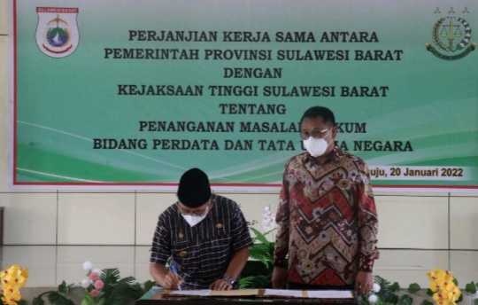Mamuju, 8enam.com.-Pemprov Sulbar bersama Kejaksaan Tinggi Sulbar teken perjanjian kerjasama tentang penanganan masalah hukum Bidang Perdata dan Tata Usaha Negara (DATUN), Kamis (20/1/2022).
