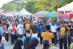 Jalan santai ini dimulai dari Anjungan Pantai Manakarra dan berakhir di Jalan Arteri. Para peserta terlihat kompak mengenakan pakaian olahraga dari instansi masing-masing, menunjukkan semangat kebersamaan.