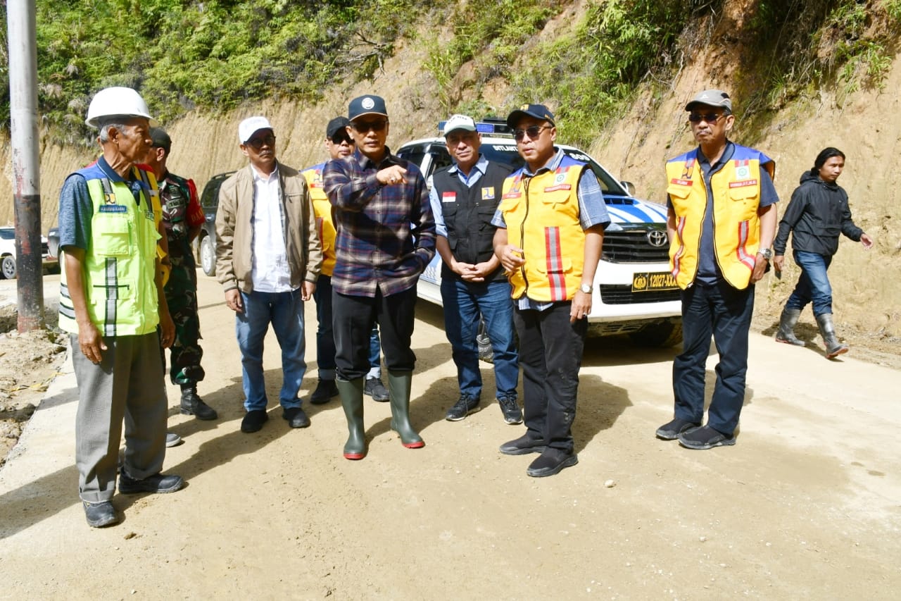Mamasa, 8enam.com.-Didampingi Pj Bupati Mamasa, Yakob F Solon dan Balai Jalan, Pj Gubernur Sulbar, Prof. Zudan Arif Fakrulloh meninjau progres pengerjaan jalan Tabone-Nosu di Mamasa, Sabtu (30/12/2023).