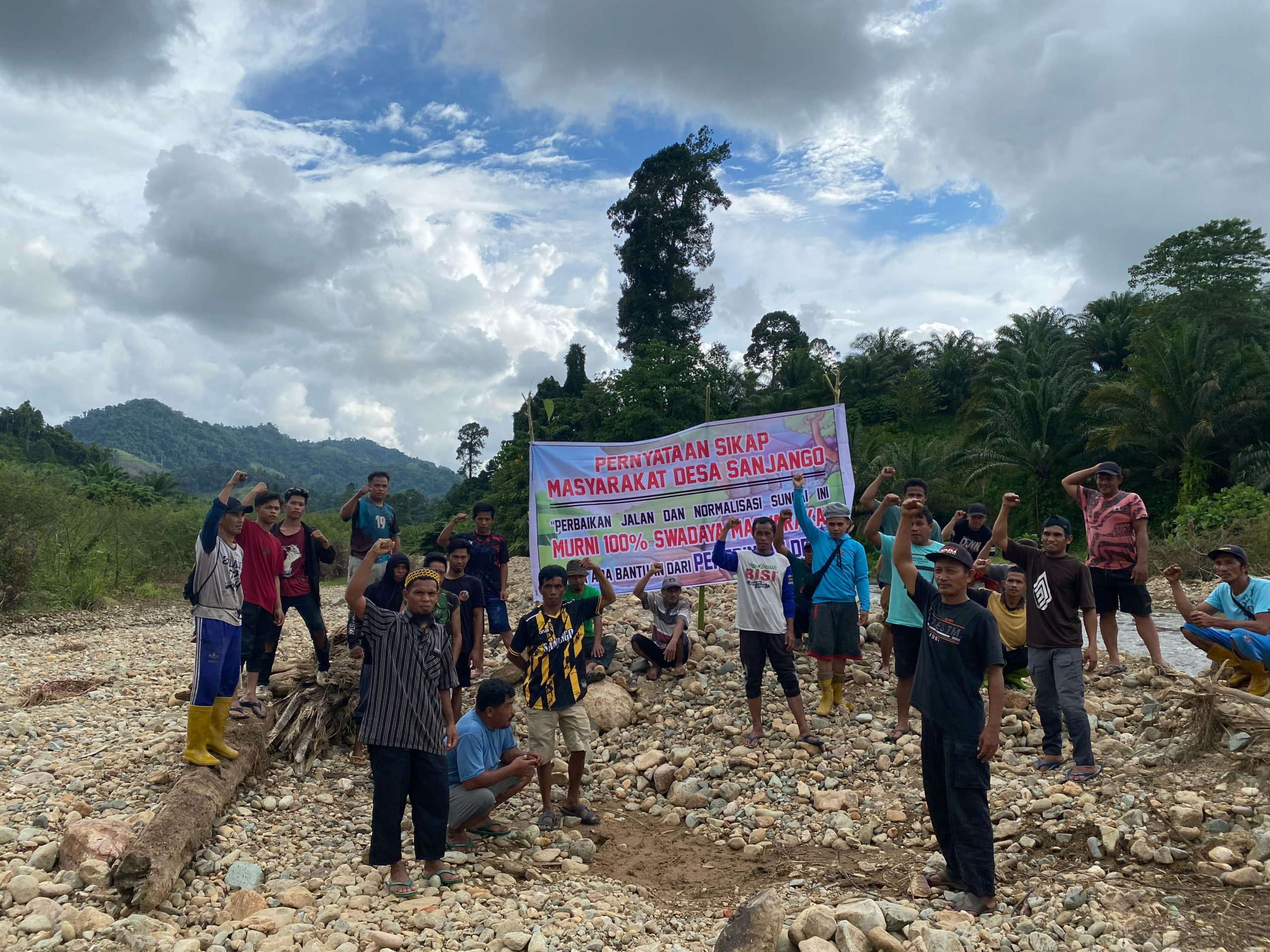 Terlihat, warga memasang sebuah spanduk besar di bantaran sebagai bentuk protes terhadap pemerintah desa sanjango yang di nilai abai atas perbaikan jalan rusak di wilayahnya.senin (17/3/2025).