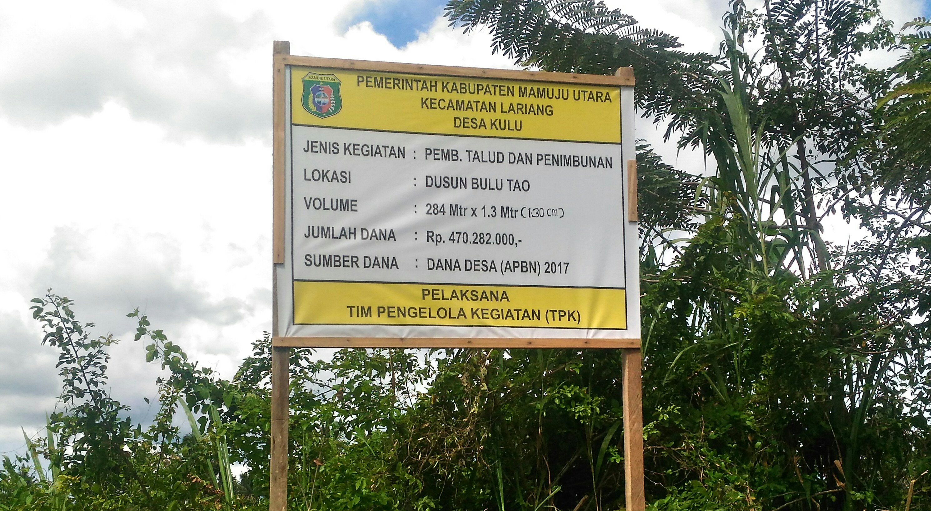 Mamuju Utara, 8enam.com.-Proyek Pembangunan Talud dan penimbunan jalan di Dusun Bulutao, Desa Kulu, Kecamatan Lariang Kabupaten Mamuju Utara (Matra) yang dianggarkan melalui Anggaran Pendapatan dan Belanja Desa tahun 2017 yang dinilai tidak wajar di bantah Kepala Desa Kulu, Acho Nandu.