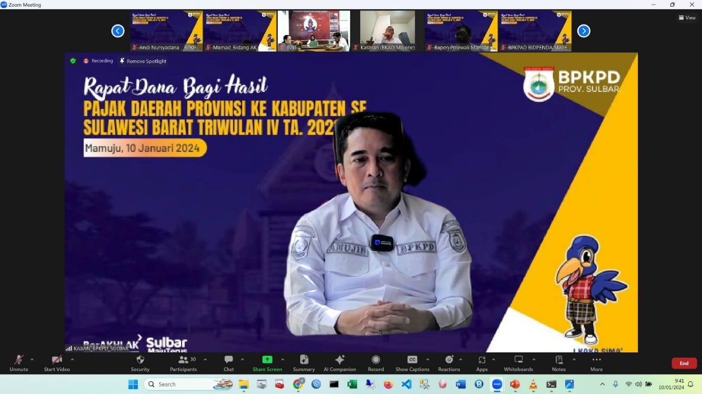 Mamuju, 8enam.com.-Badan Pengelolaan Keuangan dan Pendapatan Daerah (BPKPD) menggelar Rapat Dana Bagi Hasil Pajak Daerah Provinsi Ke Kabupaten Se-Sulbar Triwulan IV tahun anggaran 2023, secara virtual, Rabu 10 Januari 2024.