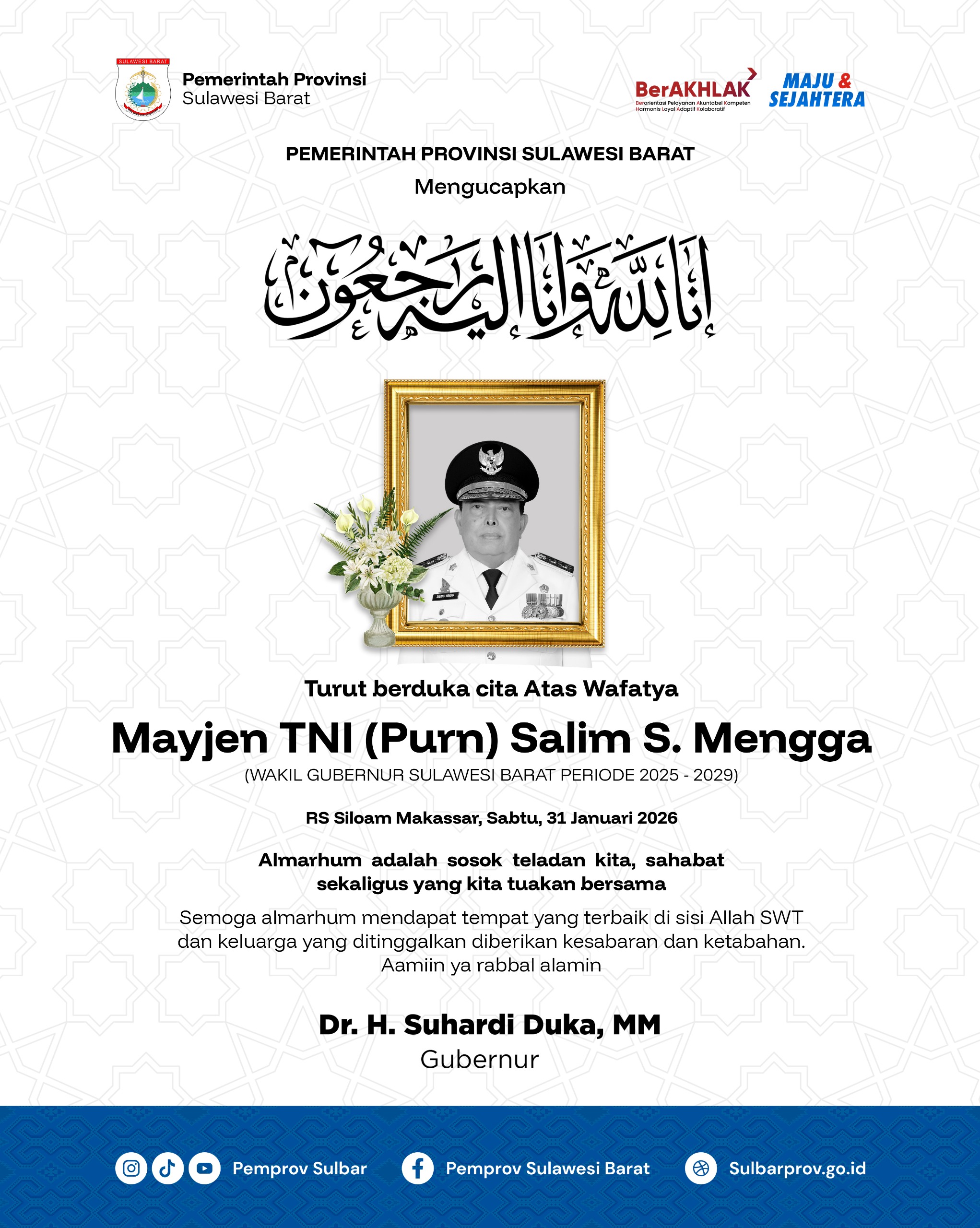 Mamuju, 8enam.com.-Kabar duka menyelimuti Bumi Manakarra. Wakil Gubernur Sulawesi Barat, Mayor Jenderal TNI (Purn) Salim S. Mengga, dikabarkan meninggal dunia pada Sabtu pagi, 31 Januari 2026. Almarhum menghembuskan napas terakhirnya di Rumah Sakit Siloam, Makassar.