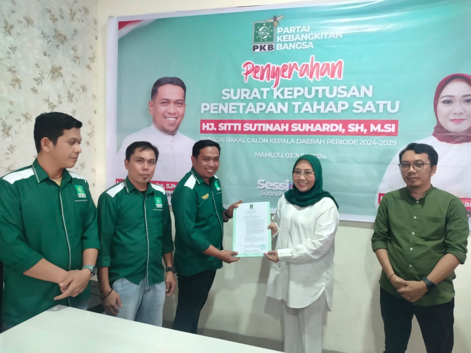 Mamuju, 8enam.com.-Sutinah Suhardi, resmi menerima surat tugas dari Dewan Pimpinan Pusat (DPP) Partai Kebangkitan Bangsa (PKB) untuk maju sebagai Bakal Calon Kepala Daerah Kabupaten Mamuju periode 2024-2029.