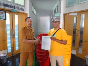 Penyerahan bantuan berlangsung di Kantor DLH Sulbar, di mana perwakilan sekolah penerima datang untuk mengambil langsung fasilitas pendukung pengelolaan sampah tersebut.