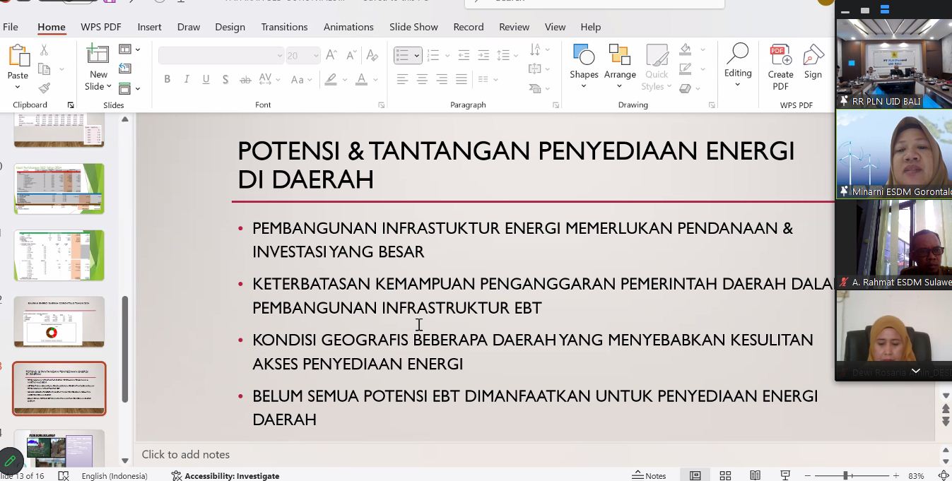 “Target bauran energi di RUED Sulbar cukup tinggi, tetapi realisasi pembangunan pembangkit EBT masih belum berjalan. Kondisi ini menjadi tantangan serius sehingga perlu dilakukan revisi terhadap RUED untuk menyesuaikan dengan kondisi faktual di lapangan,” jelas Andi Rahmat.