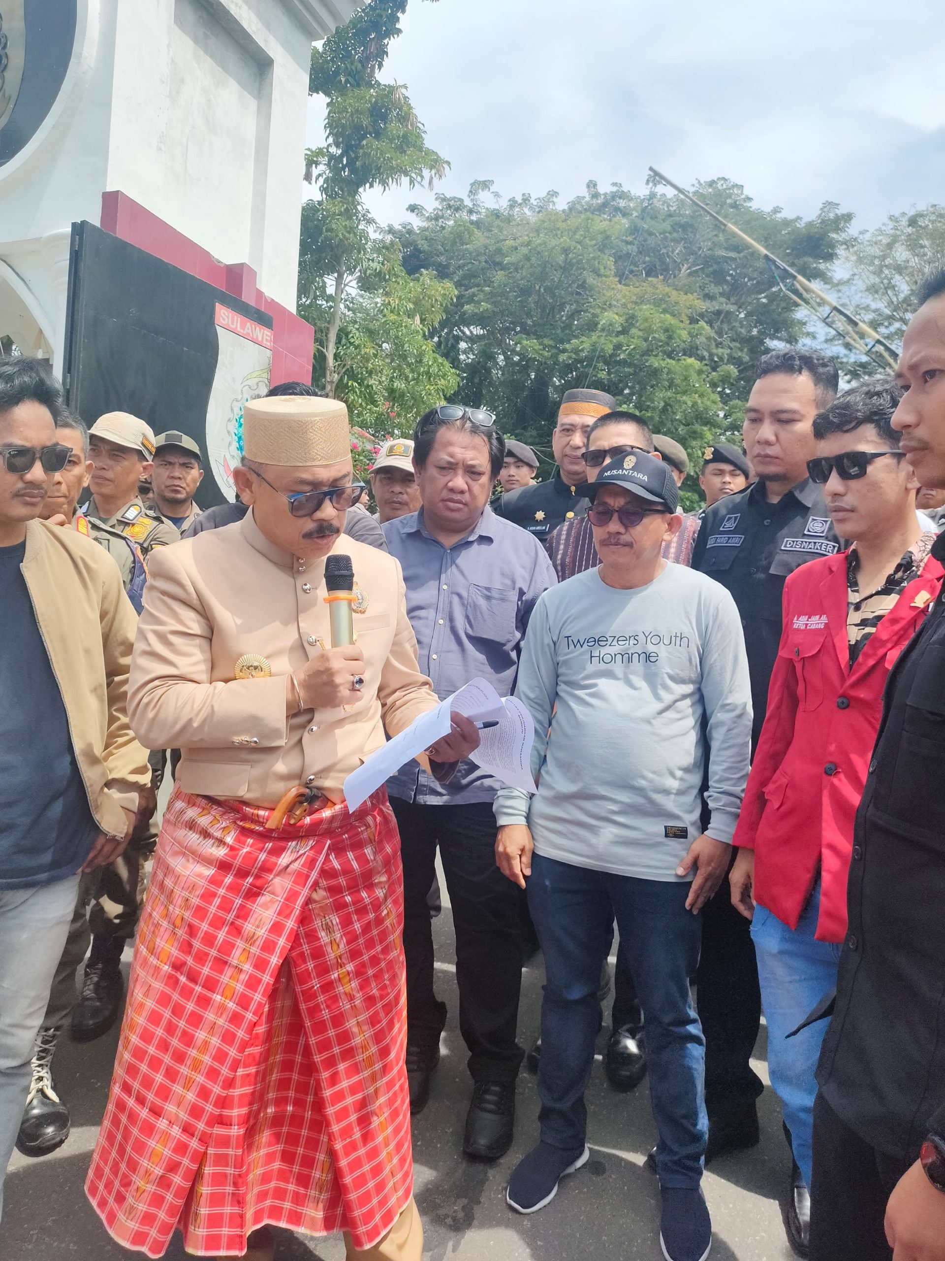 Mamuju, 8enam.com.-Gubernur Sulawesi Barat, Suhardi Duka (SDK), menemui massa aksi yang tergabung dalam Aliansi Solidaritas Perjuangan Mahasiswa Mamuju dalam rangka memperingati Hari Buruh Internasional (May Day) dan Hari Pendidikan Nasional, Jumat (2/5/2025), di depan Kantor Gubernur Sulawesi Barat, Jalan Abdul Malik Pattana Endeng, Mamuju.