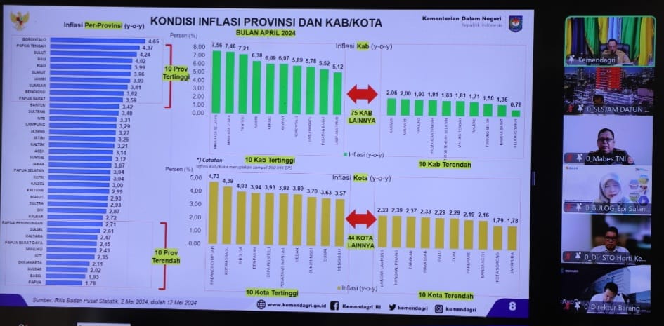 Disampaikan, dalam rakor inflasi dengan Mendagri,disampaikan, inflasi Sulbar pada April 2024 mengalami penurunan menjadi 2,02 persen, kondisi inflasi tersebut menempatkan Sulbar diperingkat ketiga secara Nasional.