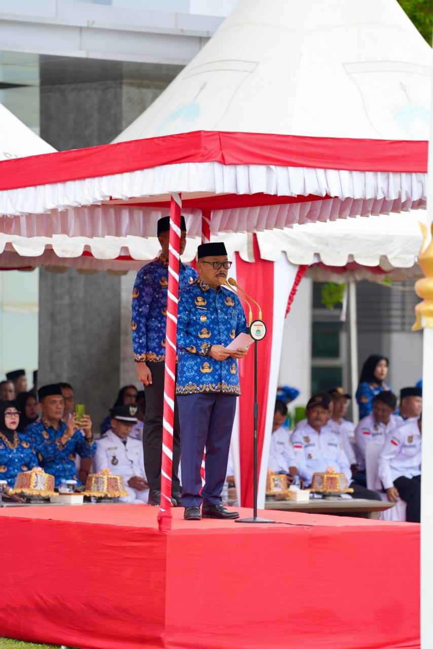 “Kita sadar bahwa 2026 ini masa yang penuh tantangan. Transfer pusat berkurang kurang lebih Rp1 triliun, termasuk dana untuk kabupaten dan desa. Namun yakinlah, tidak ada orang yang kuat jika tidak pernah menghadapi tantangan,” ujar Suhardi Duka di hadapan peserta upacara.