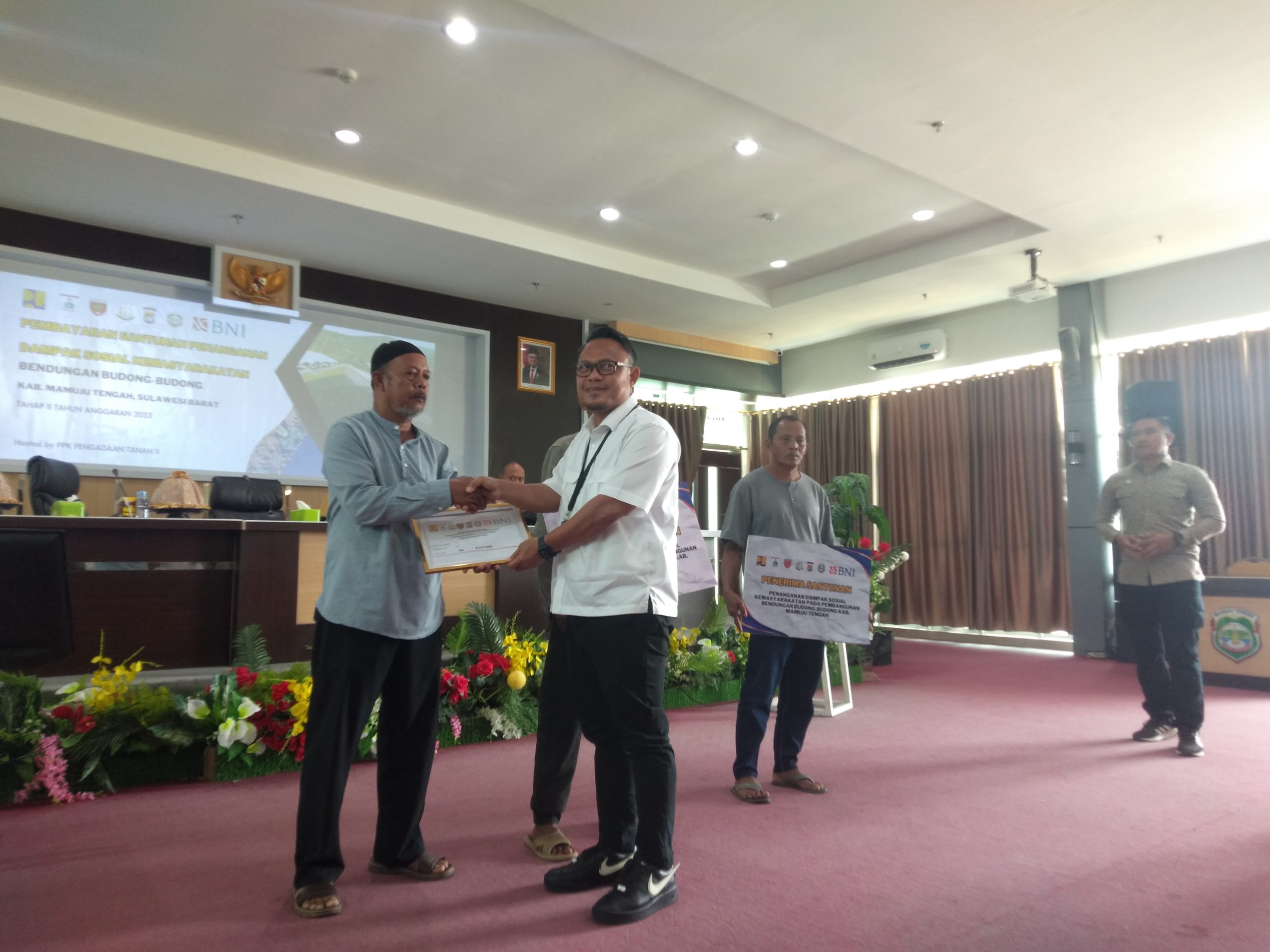 Hadir pada kegiatan tersebut, Kepala Balai Wilayah Sungai (BWS) III Palu, Dedi Yudha Lesmana, Kepala Biro Pemerintah dan Kesra Pemprov Sulbar, H. Muh. Saleh Rahim, Kasi Datun Kejati Sulbar, Kapolda Sulbar di wakili oleh Kapolres Mateng, Danrem 142 Tatag, Asisten 3 Pemkab Mateng, Kadis Perkim Sulbar, Pimpinan Perbankan, Kepala Desa Salule’bo dan masyarakat Desa Salule’bo penerima pembayaran santunan.